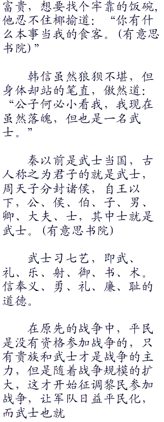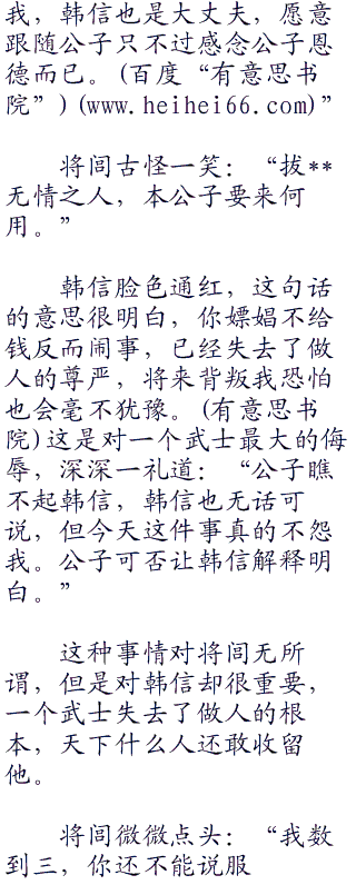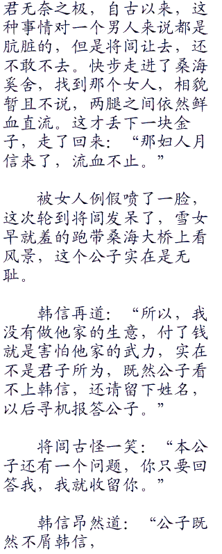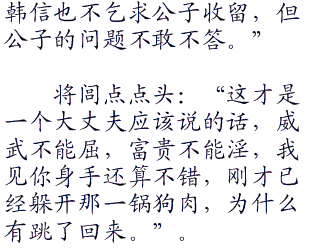“公子是什么人,你于我有恩,有恩不报非君子,韩信愿意追随公子做个门客。”
