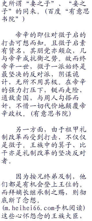 当此之时,帝祖甲的礼制改革已逐步取得正统地位,嫡长继承制的王位传承已取代兄终弟及而成为主流。因此,微子启虽然是帝乙的长子,并与帝辛是一母所生,但因为其母生微子时地位尚低,故微子为庶出。
