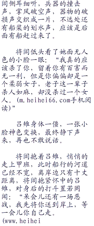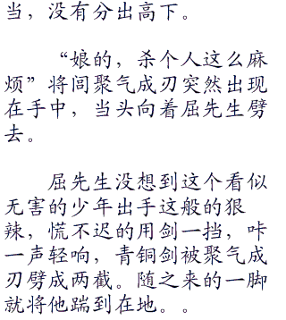 “如果你在不闭嘴,恐怕留在外面的那个人,就得死了。”将闾侧耳细听片刻,外面剑锋啸鸣,显然那个青衫客落了下风。