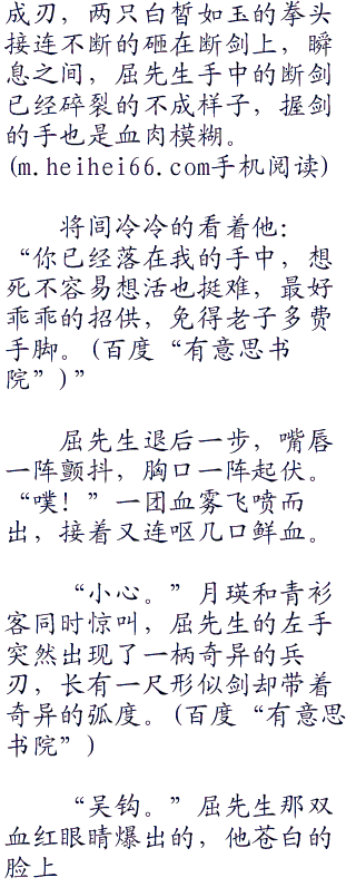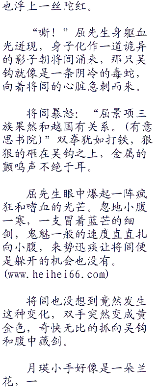 “喝”屈先生手中的断剑只剩下一尺多长,依然挥舞着断剑向着将闾攻来,招招凶残只求同归于尽。