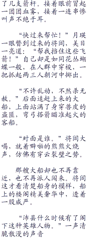 “砰”屈先生四脚朝天跌倒在甲班上,青衫客强行提起的一口真气也贼去楼空,双腿一软也躺倒在地,二人惊骇的目光看向将闾。