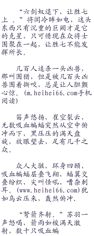 虽然黑豹被胜七所伤,但是泗水亭外兽吼连声,头顶上有聚集这大批的吸血蝙蝠,情况并不乐观。