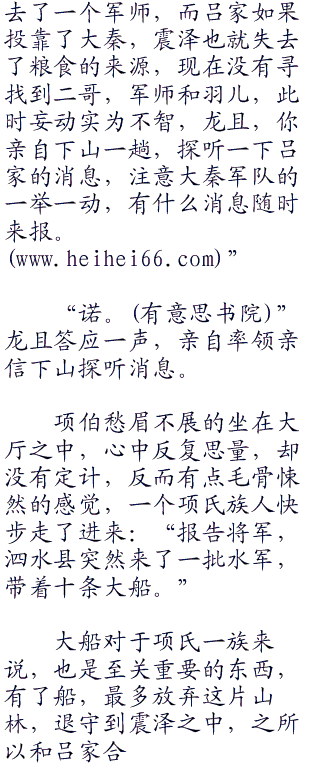 项伯在大厅中团团乱转,反复的思量,在军事上他不如项燕,在分析军情上远逊于范增,转的龙且头都晕了,就见他跪坐在席上,沉思道:“屈先生已死,震泽就失