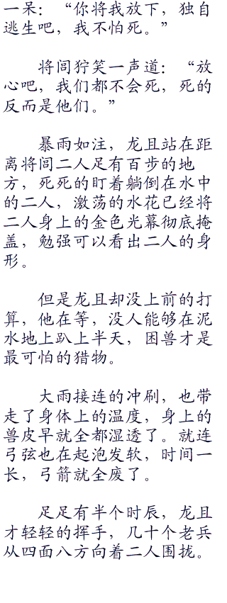 龙且从来就没想过,几十个铁血老兵,项氏一族最好的猎手,竟然在一瞬间被腰斩了几十个,但是在这缓坡暴雨中,就是百战之余,也不能组成战阵。
