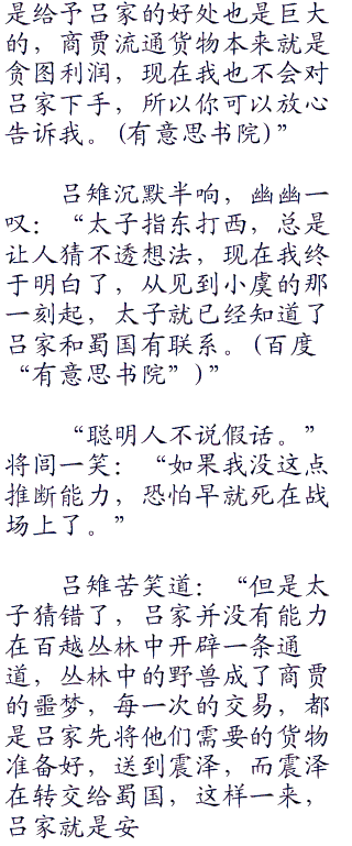 过了一会儿,里面还没什么动静,将闾干咳一声道:“吕姑娘,蜀国的小虞来到泗水郡,也是来和吕家做生意吧!”