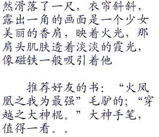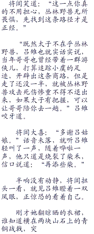 篝火熊熊,光影朦胧,隐约之间看到吕雉的小手在身上摸索,将闾微微一愣,随即醒悟过来,吕雉已经开始脱女孩子的贴身衣服,这些东西总不好挂在上面。