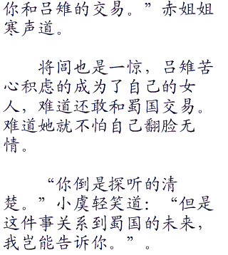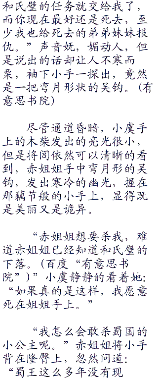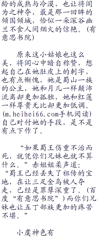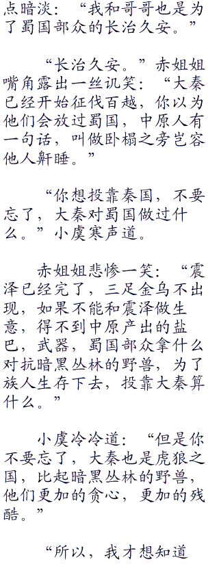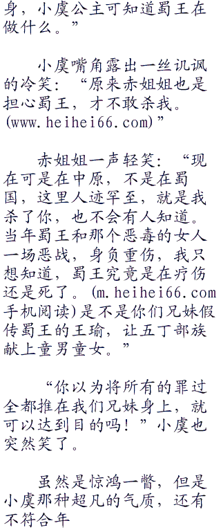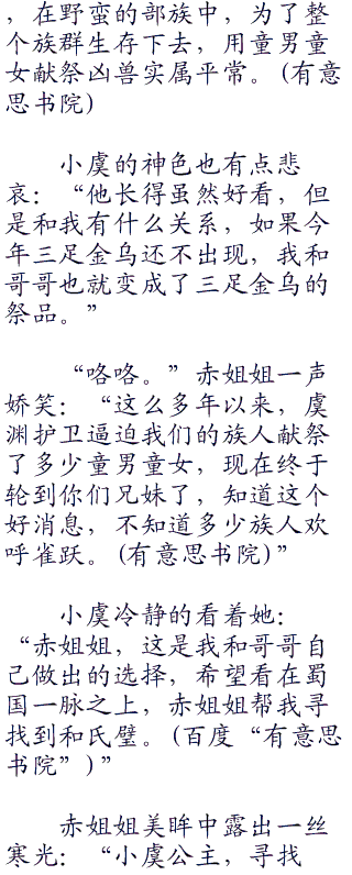 “为了蜀国部众能在暗黑森林生存下去,我也只能牺牲自己了,总比眼睁睁的看着族群每年选拔童男童喂食三足金乌的好。”赤姐姐声音一变,悲惨的声音变得荡气回肠,带着几丝魅惑:“听说那个少年公子长得英俊的很啊!小虞没有用蛇蛊术杀了他,难道舍不得,也对啊!中原的少年长得本来就比蜀国部众俊俏。难道你也想留在中原。”