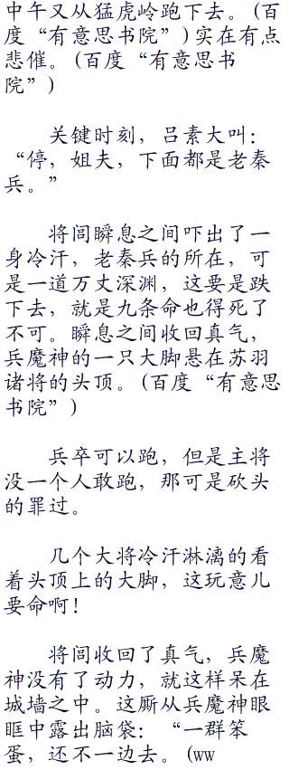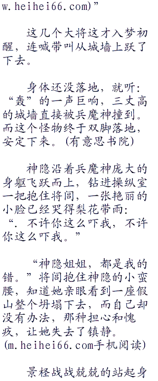 二女全都无语,兵魔神不认路,将闾看不见路,这两个恶魔配合在一起,简直是人间的噩梦。不用战剑,光凭踩一个人也都活不了,更别说那个大的让人触目惊心的战剑,总是胡乱的挥舞。