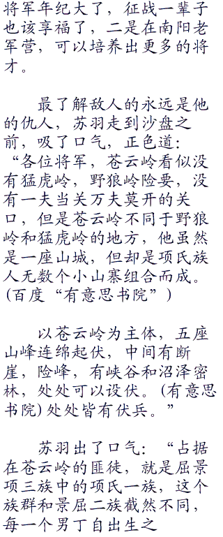 而中军幕府之中,韩信等人正在听苏羽,刘季等人相互补充苍云岭的地形。