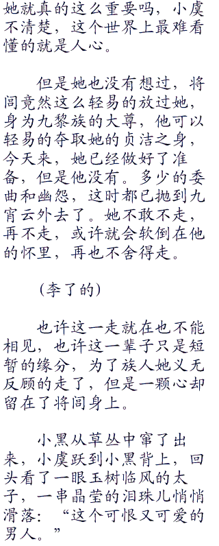 “你说的都是实话,但是我心中却在滴血。”小虞幽幽道。