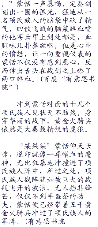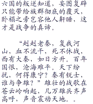 而站在城头上的黄金火骑兵,也发出山呼海啸的呐喊,”赳赳老秦,复我河山。血不流干,死不休战。西有大秦,如日方升。百年国恨,沧海难平。天下纷扰,何得康宁?秦有锐士,谁与争雄?!”雄壮的战歌声中,黄金火骑兵已经跟随在他们的主将身后,挥舞着定秦剑从城头上杀了下来。