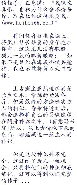 “那个老乌龟,让我修炼神识。”将闾一想起自己千防万防还是家贼难防,不仅费劲心机“二零七”得到的兵魔神中蕴藏着蚩尤的神魂,就连凰儿送给自己的黄石天书中也有黄帝的神魂,一个个虎视眈眈的等待自己修炼到金身不灭,然后夺舍重生鸠占鹊巢,你们都把当老子当成什么了,随便捏的软柿子。