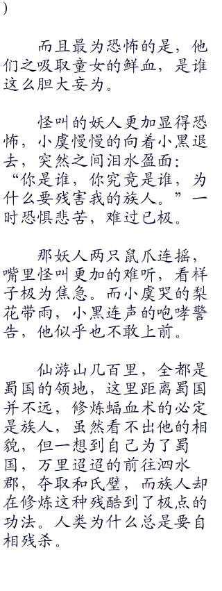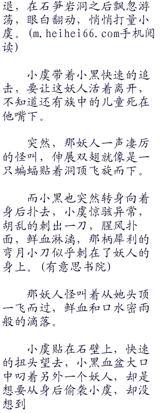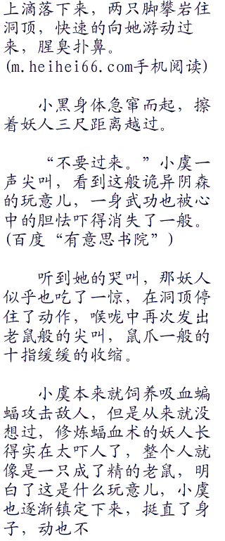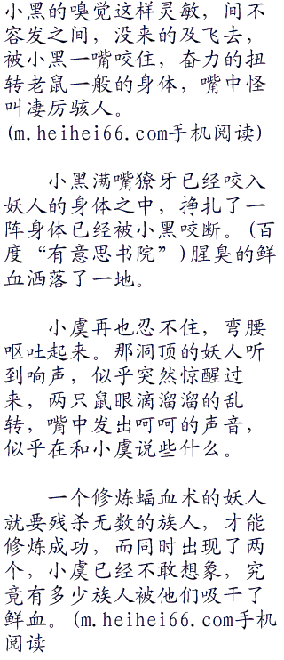 小虞又是害怕又是恶心,蝠血术是南疆之中最诡异的一种法术,修炼之时需要将吸血蝙蝠的毒素注入身体之中,而且每天吸食人类的鲜血,才能维持生命,极度残忍,已经被列为蛮疆禁术,修炼者杀无赦。