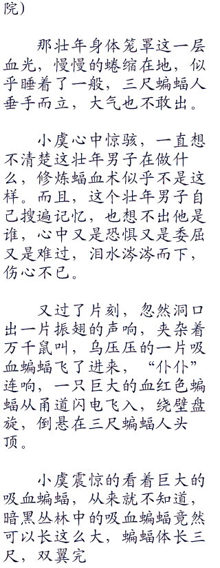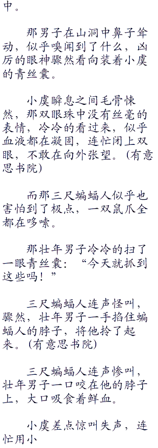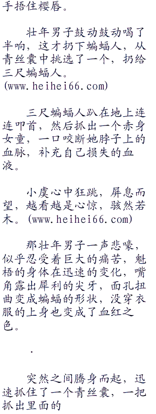 小虞感觉眼前漆黑一片,转瞬之间就被妖人挂在洞顶之上。心中又惊又怒,这个妖人好生狡猾,竟然趁自己不备,出手偷袭。