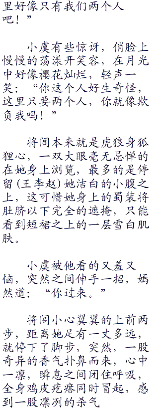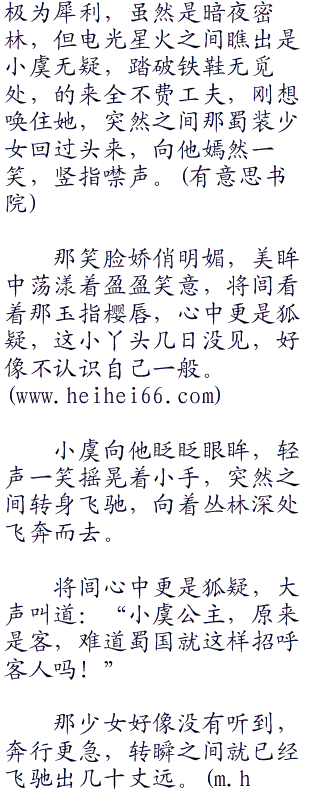 那小女身穿蜀国盛装,头戴银冠,项带银环,短裙飘飞犹如山中的精灵,急速之间从将闾眼前飞过。