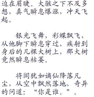 将闾心中一凝,小镇中的强盗虽然都身怀武功,但却没有这样高明,而且来人提气飞奔,穿林而来,难道来的是蜀国高手。双眸一眯,循声望去,只见远处树枝摇曳,果然有人轻飘飘的踏叶疾行。