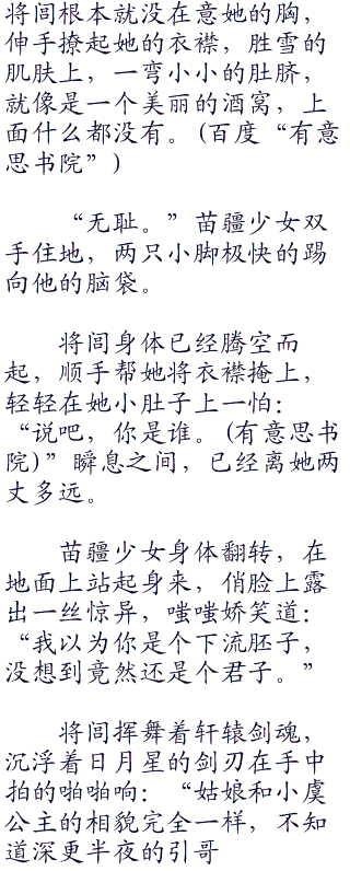 苗疆少女也没料到他这般的无耻,那里会真个被他抓到,忽然收胸后仰,身体好像一弯美丽的拱桥。却没想到