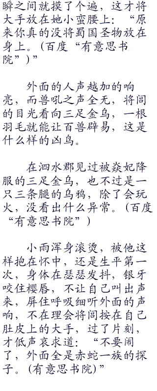 小雨急的直跺脚:“他们看见你,还不知道你和我在一起吗!快跟我走。”拉起将闾的衣袖,钻进了三足金乌的塑像之后。