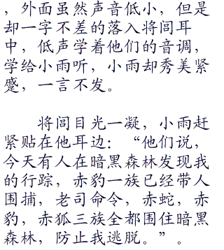 兽吼之声越来越响亮,远远听见一阵兽语,将闾却听不明白外面嚷的是什么,小雨低声道:“他们说,仔细搜索每一个地方。”