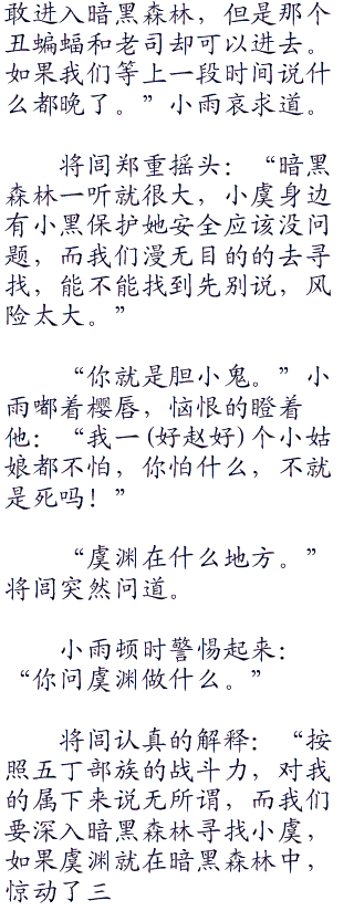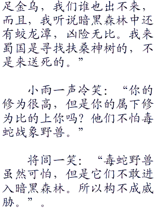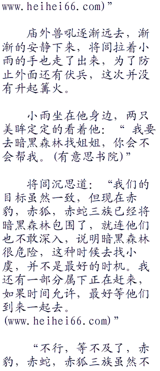 小雨一边听一边说:“外面的是赤蛇和赤豹,赤蛇说,今天还有人看见我,所以才一路追来。