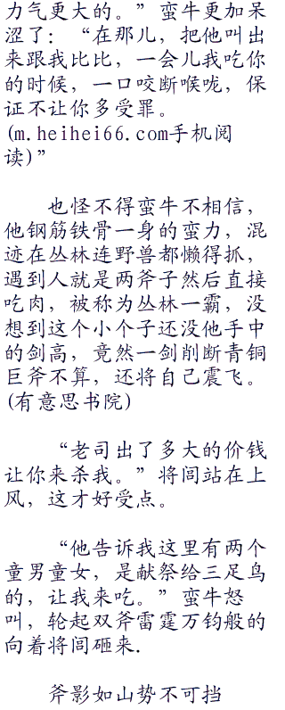 小雨已经吓得花容失色:“他,他是流浪在丛林中的野人,先被小镇上的人收养,后来饭量太大被驱赶出来,最爱吃的就是童男童女。”