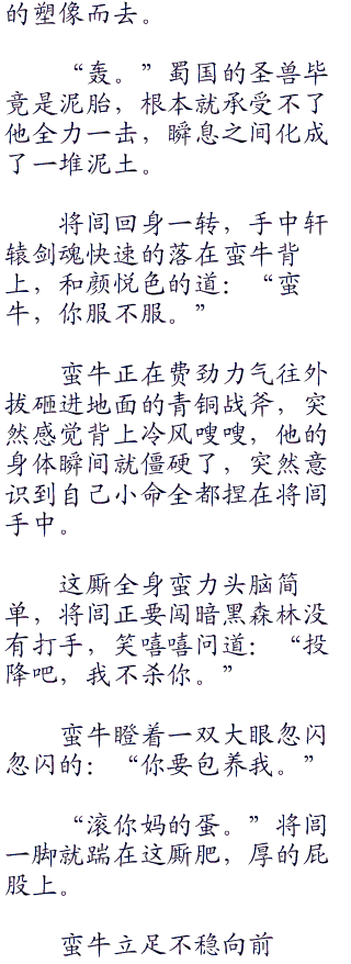 蛮牛喋喋不休的走进小庙,一只大手抓着一个青铜战斧,距离将闾两丈远的地方停住脚步,饥饿的眼神盯着将闾和小雨,就像是两头美味的羔羊。