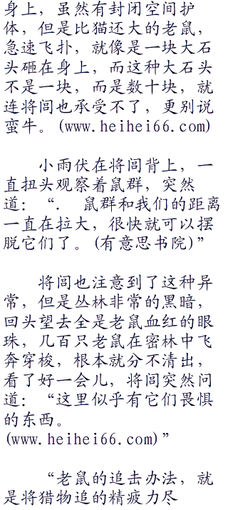 “一只两只老鼠并不可怕,甚至可以成为人的食物。”小雨的脸上写满了畏惧:“但是千百只老鼠,可以将一个村庄吞噬一空。就连最凶蛮的丛林黑豹,看到鼠群也只能逃跑。”