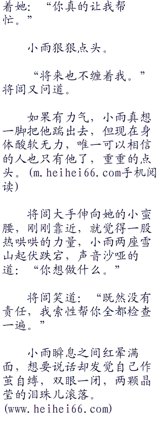 将闾低头看了小雨一眼,见她耳后都是一片嫣红,光洁脊背上除了黑色伤口,肌肤粉绒绒的,呼吸也粗重起来,快速的帮着包扎好伤口,不由得泪牛满面,老子终于做了一次柳下惠。