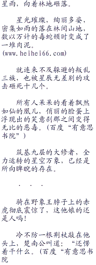 站在野象王背上的凰儿瞬息化成了一道电光,犀利的矛尖喷吐出无数的星光,环绕巨蛇盘旋而上,突然之间璀璨星辰轰然炸裂。