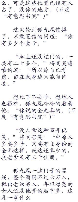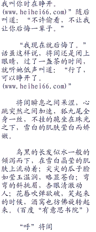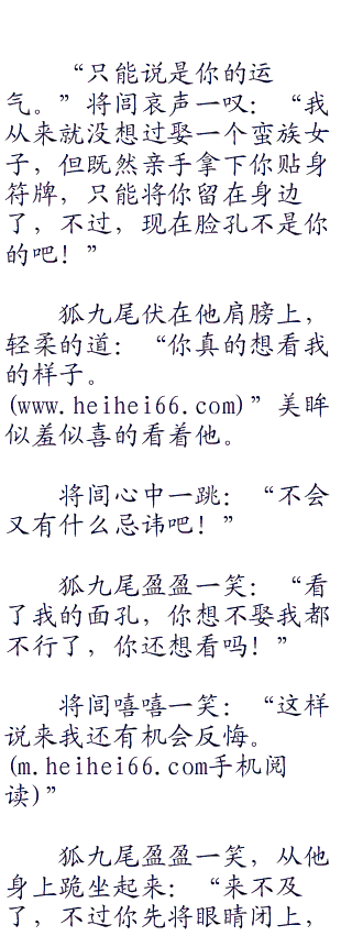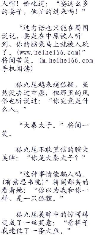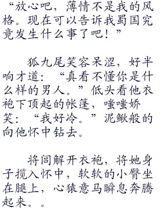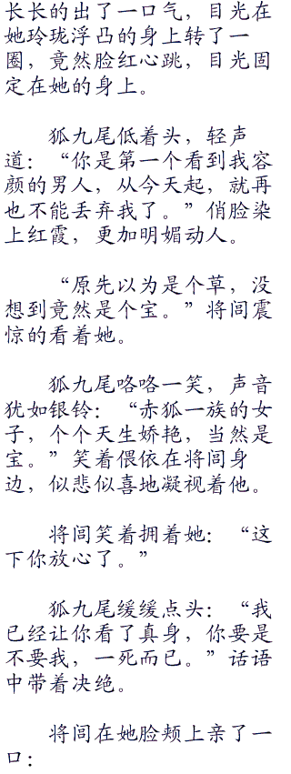 狐九尾羞恼的看了他一眼:“蜀国的女子,被男人看了身体,如果不杀了他只有嫁给他,这下你满意了吧!”