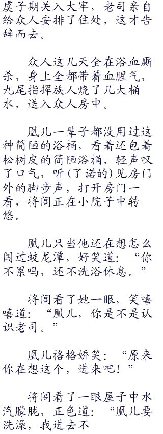 老司看了一眼凰儿,见她一言不发眸光全都落在将闾身上,一声叹息:“蜀国虽然天气炎热,但也有落雪的时候,一旦天气寒冷起来,震泽蛟龙就会藏在洞穴之中隐藏不出,这是唯一能够进入虞渊的时间。”
