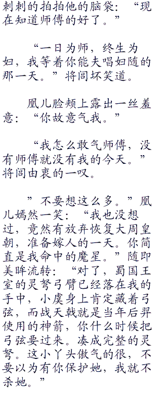 凰儿俏脸一红,嗔怪道:“你还一口一个师傅的,有抱着师傅的徒弟吗!”