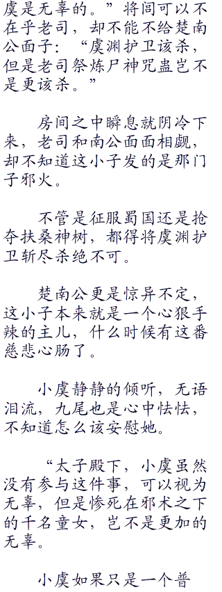 小虞黯然泪流,九尾也不知道怎么安慰她好了,将闾更是愁眉不展,小虞可怜不代表蜀国王族无罪,尤其是用童女修炼邪术这是将闾极力要掩盖的事实。