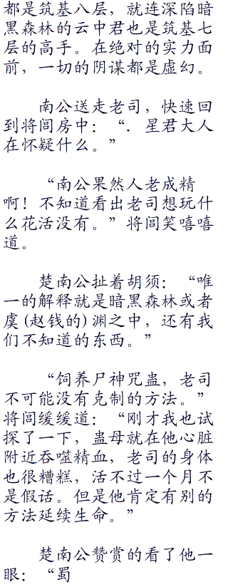将闾骤然看向南公,楚南公老脸上露出一丝哀色:“属下已经帮着老司检查过来,除非有绝世高手帮他驱逐蛊母,不然,老司的寿命只有一个月了。”