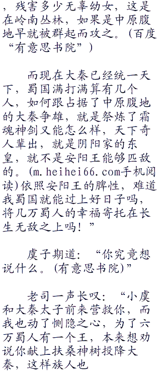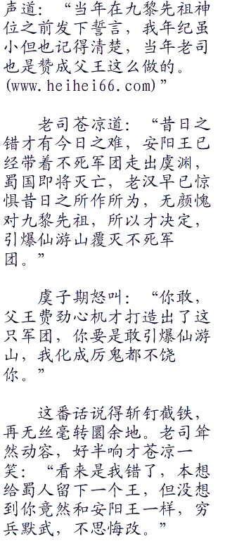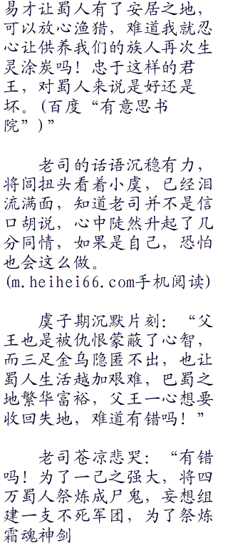 老司大笑:“你错了,我忠于的是蜀国,而不是什么王族,安阳王丢失巴蜀重地,带着族人迁徙来到祖地,他为蜀人做了什么事,一心想要夺回巴蜀,穷兵默武,为了让自己变得更加强大,违背祖训强行祭炼霜魂神剑,命令族人献上儿女。
