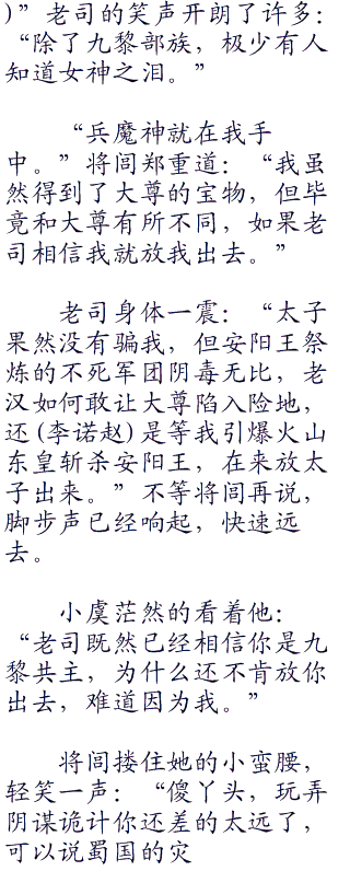 小虞痛哭道:“祭炼尸神咒蛊还是祭祀三足金乌,都是以人为祭品,为了防止他们破口大骂亵渎了神灵,都会喂食一种让人失去知觉的丹药,这就是失神丹。”