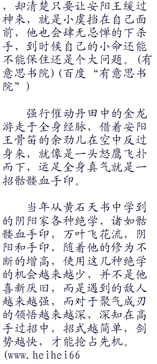 其实将闾从一照面开始,就故意示弱助涨安阳王的气势,暗中养精蓄锐等待巨毒发作,不死武卒如果一旦祭炼成功,那对天下就是一种灾难,没有见到不死武卒彻底灭绝之前,就是将安阳王宰了也没什么意义。