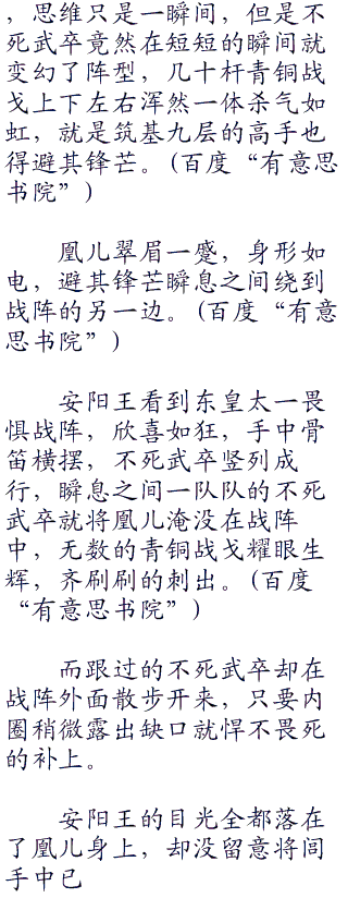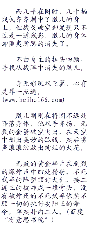凰儿嘴角露出冷酷的笑意,倒持青铜战戈长柄轻轻一挥,就将一排刺来的青铜战戈荡漾开去,身体突进