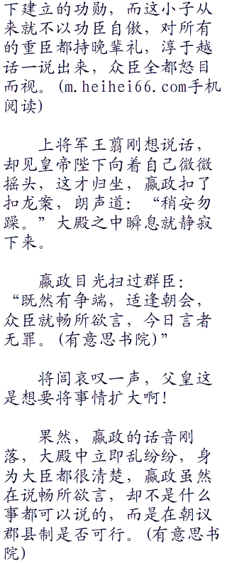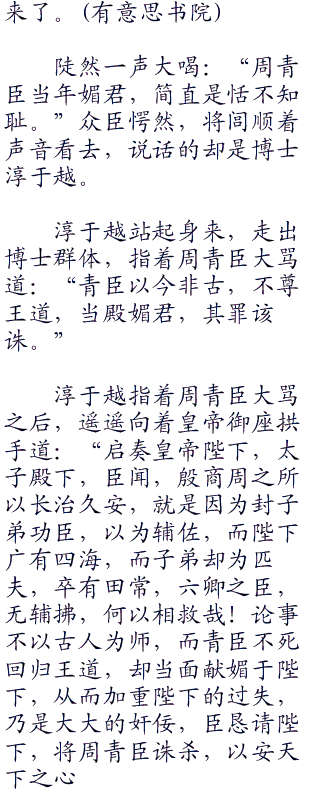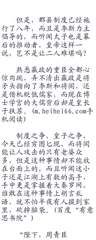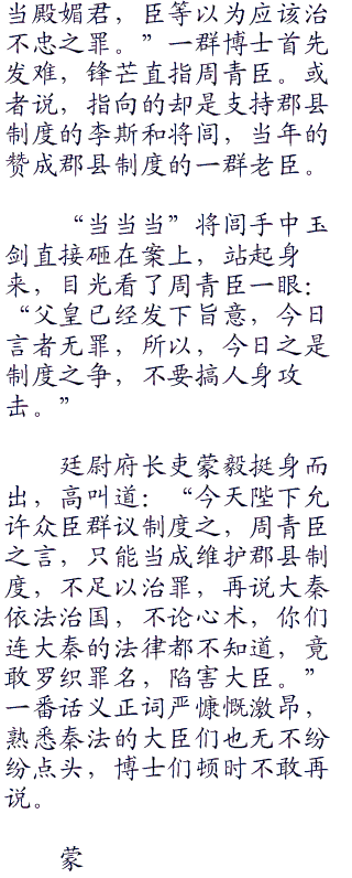但是周青臣却再也忍受不了儒生的冷漠了,站起身来,拱手高叫:“臣,周青臣有事启奏。”