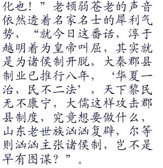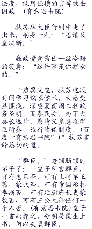 除奸佞这句话是他说出来的,却被执掌律法的大臣批驳的体无完肤,扭头看了一眼正襟危坐的皇子扶苏,心中顿时勇气倍增:“臣和三十三名博士联名上书,再次恩请终止郡县制,效法夏周商三代,分封天下以立诸侯,做事不以古人为师而不能长久,为了大秦千秋万代计。恳请皇帝陛下恩准。