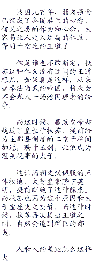 将闾也是一声哀叹,不懂法而想要改制,这种闹剧也只有被儒家学说蒙蔽了心智,变成了愚儒的扶苏说出来。掌握法律很重要啊!现在不用自己动手,扶苏也会被父皇唾弃,被朝臣疏离。