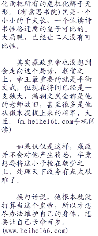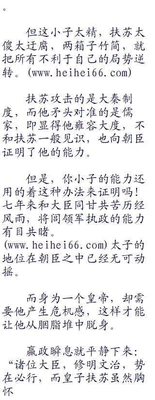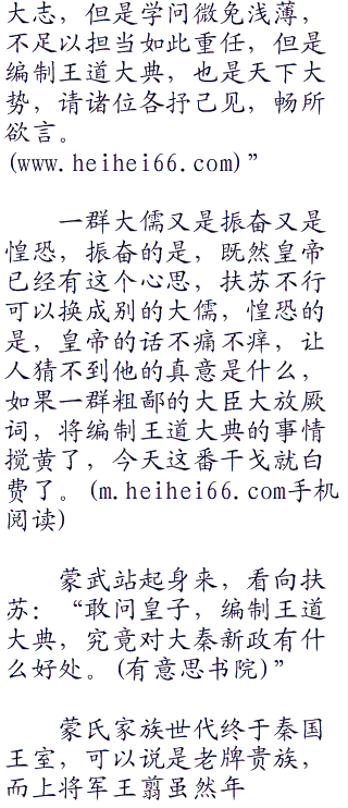 真的仅仅是编制王道大典吗!这不仅仅需要治世之才,还需要通晓世事,就是一个举世闻名的大儒,也不敢说自己编制一本书,更何况他还想推广天下,让大秦政令按照王道大典运行,而且扶苏口气极大,满殿的大臣反而没有一个人说话了。