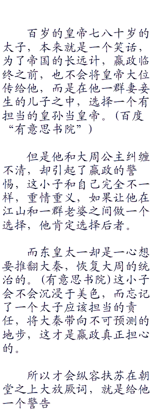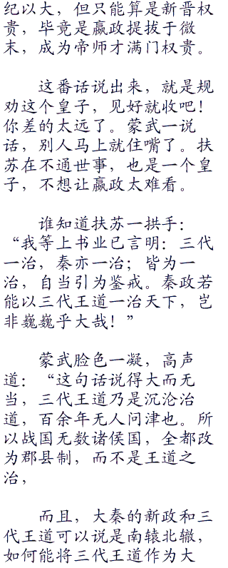 主要是扶苏的话不仅迂腐还很荒谬,夏周商是诸侯分封制度,而大秦却是郡县制度,扶苏却硬要将诸侯分封的天子之治和大秦皇帝的郡县天子之治扯成一样,荒谬可笑不说,偏偏还装成一副庄严肃穆样,他和这群大儒究竟想做什么?