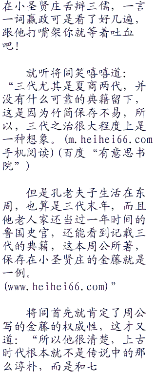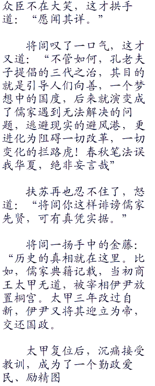 将闾拿出金藤,绝对不是证实三代之治这样简单,他的真实目的,就是把读书人推崇的三代,也就是夏商周,那种读书人理想的国度,一脚踩在底下。让儒家学说变成建立在胡说八道上的垃圾,再也翻不过身来。