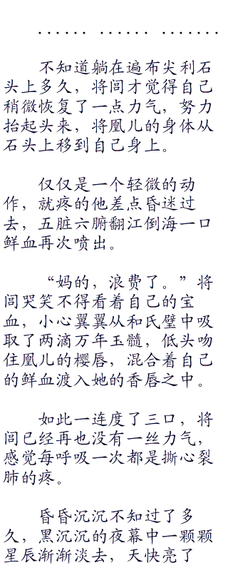 凰儿紧紧的搂住将闾的脖子,泪如雨下,自从大周灭亡家国沦丧,大哭一场之后,她就再也没有流过那怕一滴眼泪,这个世界需要压倒一切的实力,而不是廉价的泪水。