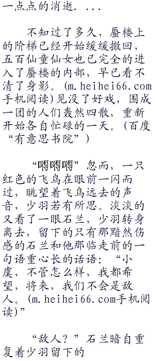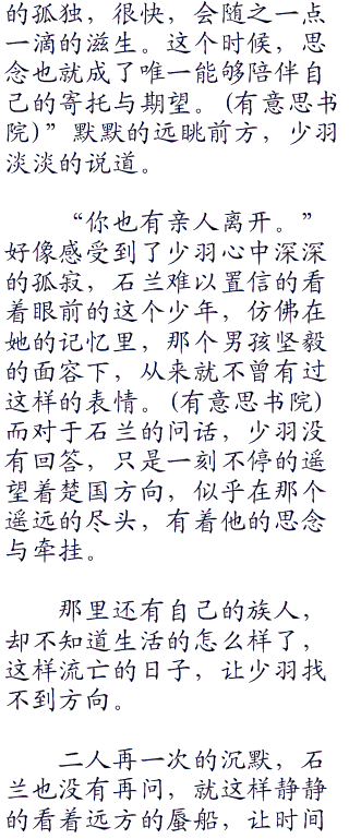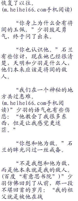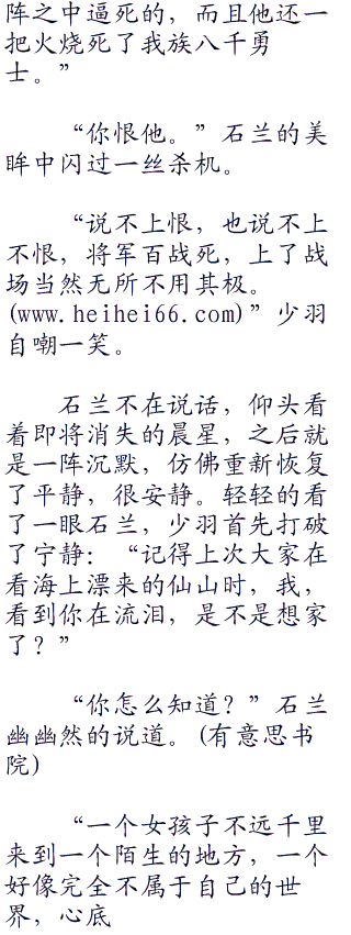 见石兰不说话,少羽也不恼,慢慢的走到她身边一起遥望:“石兰,你的蜀国名字叫什么。”少羽轻声问道,就像是问一个毫无相关又莫名其妙的问题。