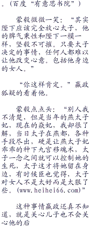 蒙毅偷偷的看了他一眼,终于明白嬴政担心什么事,腼腆一笑:“太子的能耐无人可比,自古美女爱英雄,白龙鱼服行走江湖,肯定要招蜂引蝶的,只不过太子性格坚毅,虽然对女人极为疼爱,但也没有一个女人敢违背他的命令。”