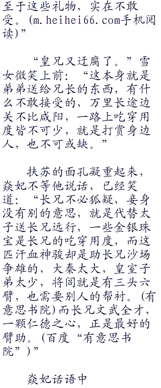 焱妃轻轻摇头:“这件事和皇兄没有关系,即便是没有这件事,太子也有此一劫,是逃脱不了的。”双手高举手中青铜箱子:“闻皇兄远行,时间仓促来不及置办,这只青铜箱子里面是一些金银珠宝,还有这匹汗血神骏名叫白义,一起送给皇兄,祝皇兄在九原建功立业,等太子回归,妾身也会劝太子恳求陛下,让皇兄早日回归咸阳。”