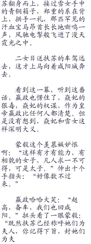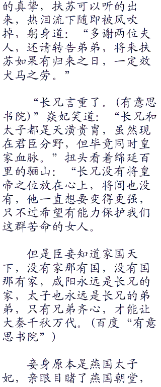 扶苏愣了,随即热泪盈眶,皇子出咸阳文武百官畏惧皇帝之威,没有一个人来送行,反而是太子东宫的两个妾室,清晨赶来:“多谢两位夫人高义,今日能送扶苏已经感激不尽,