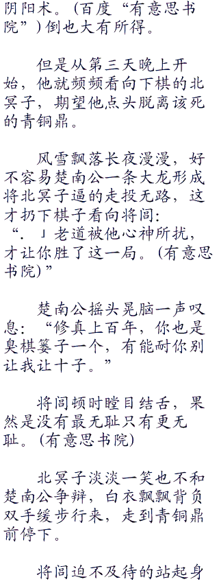 将闾还没明白过来,已经抱着凰儿瞬移出洞外,就见楚南公和北冥子正在下棋。